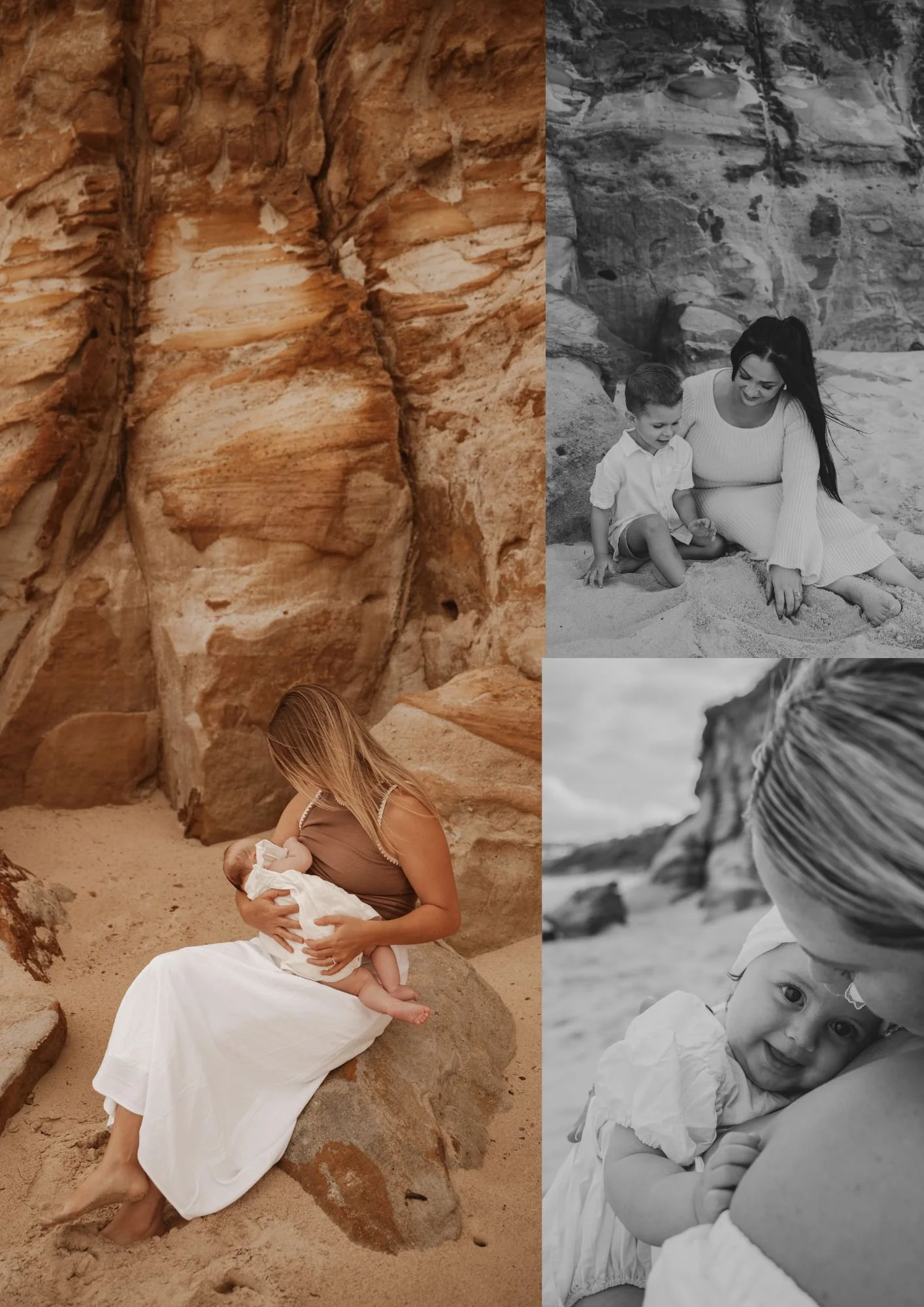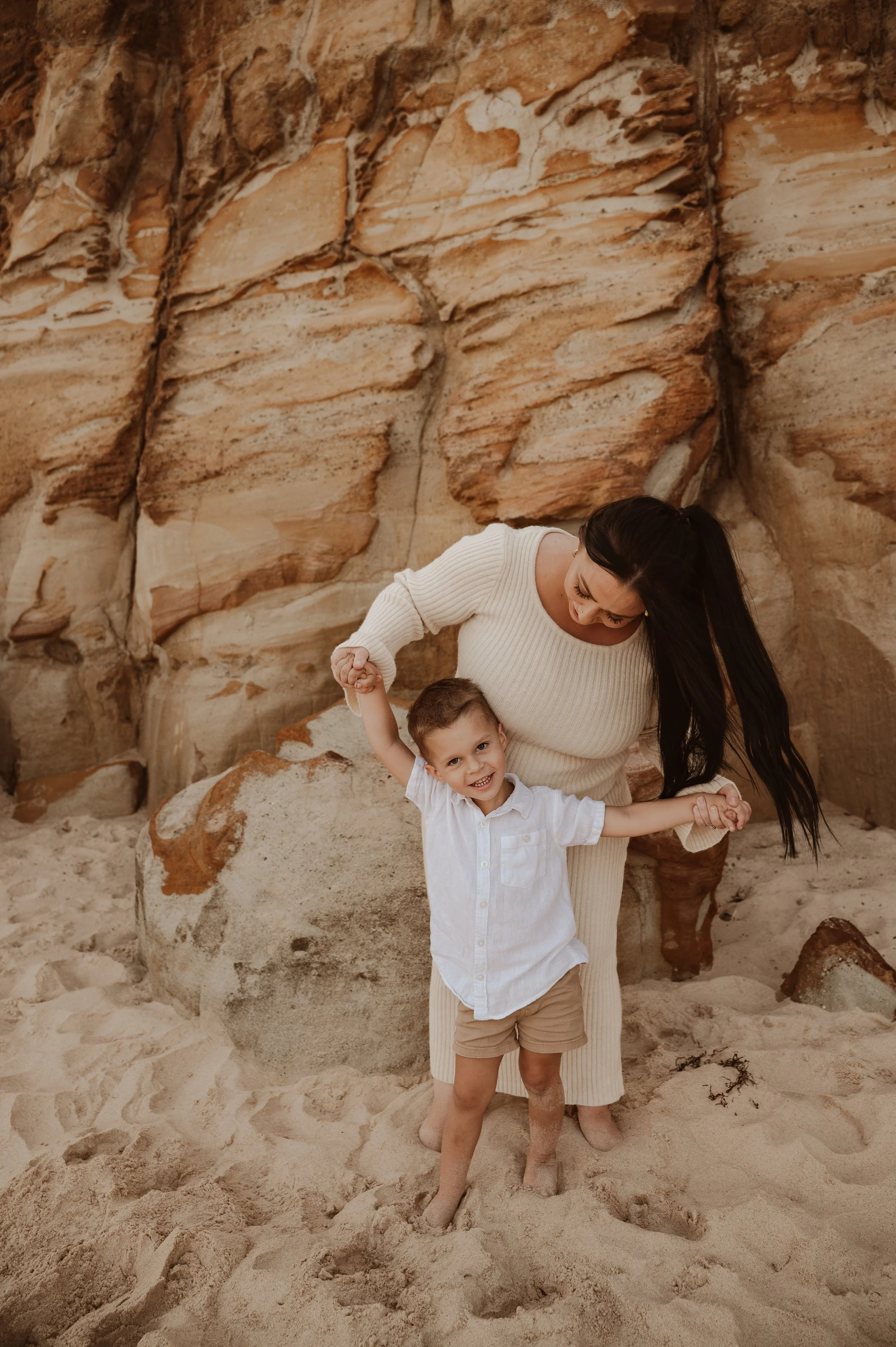 Snuggle together on the sand with beautiful rocky textures as our backdrop. Keeping the props minimal this allows us to focus on your connection with your loved ones. If you're a beige loving mum this has your name written all over it.